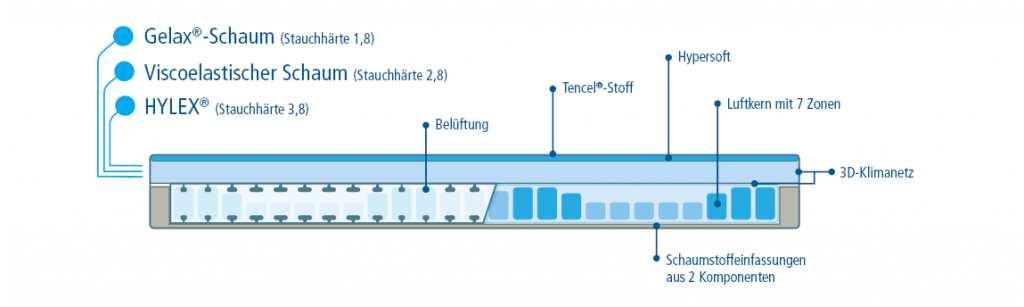 Ob Sie auf Bauch, Rücken oder seitlich schlafen: Das Tribrid® Air Liegesystem passt sich Ihrem Körperbau und Ihrer Schlafposition ideal an. Denn durch Auswahl des für Sie optimalen Toppers und der Regulierung des Drucks im integrierten Luftkern erreichen Sie eine gleichmäßige Körperunterstützung. Der spezielle 7-Zonen-Luftkern beinhaltet verschiedene Kaltschaumeinlagen, die der menschlichen Anatomie nachempfunden sind und stabilisierend wirken.