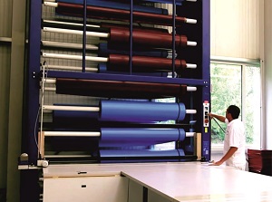 Bei der Herstellung der Wasserkerne wird die Folie von der Rolle abgeschnitten und nach sämtlichen Verarbeitungs- und Schweißvorgängen entsteht die Wassermatratze.